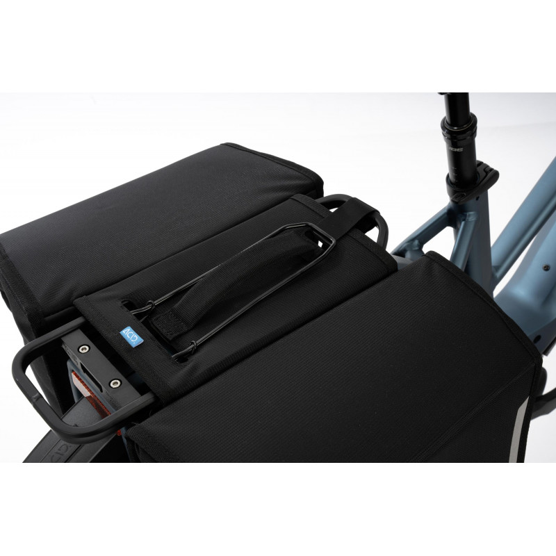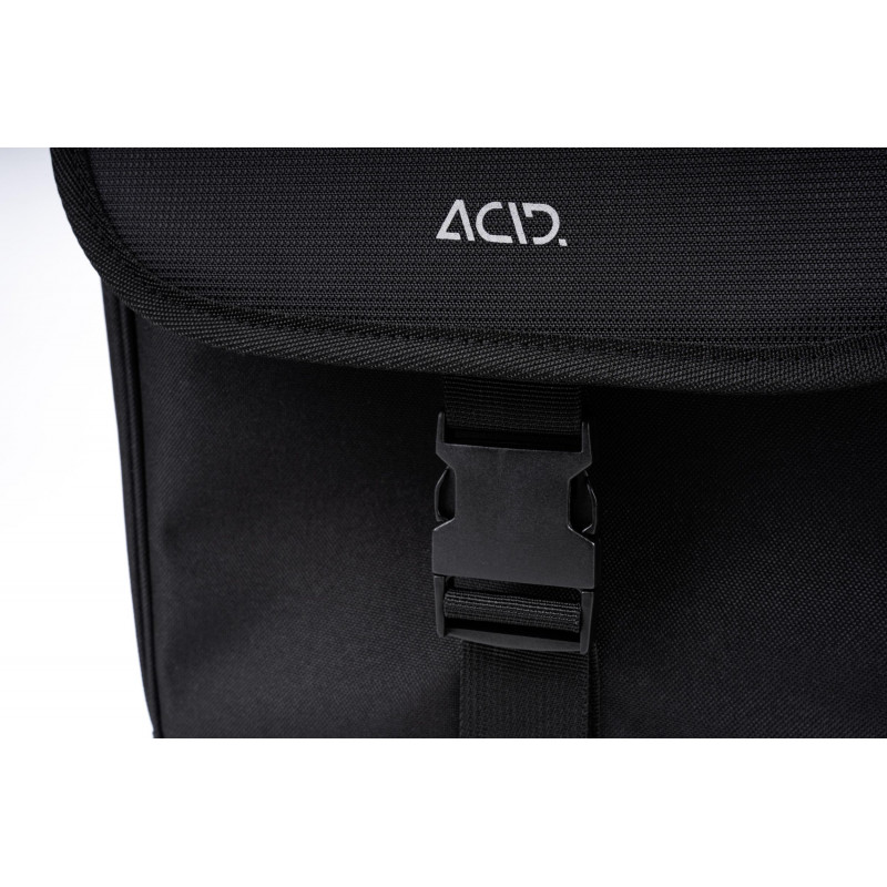 Odolné a oderuvzdorné tašky ACID CITY 15 DOUBLE sa ľahko upevňujú na nosič batožiny pomocou pružinovej svorky.