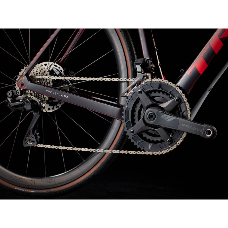 - Domane+ carbon, tapered carbon steerer, internal brake routing, fender mounts, flat mount disc, 12x100mm thru axle