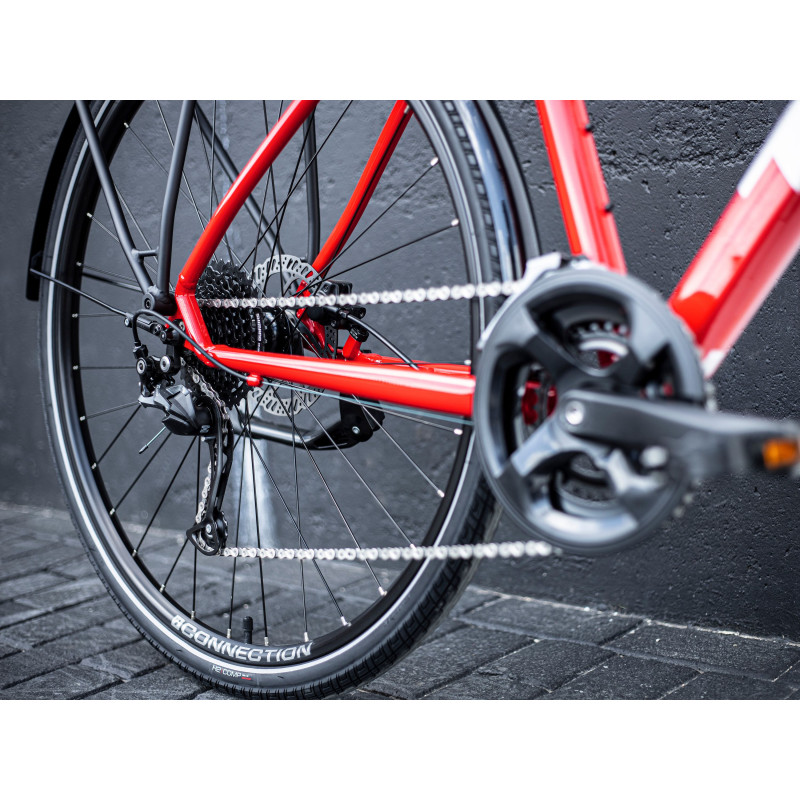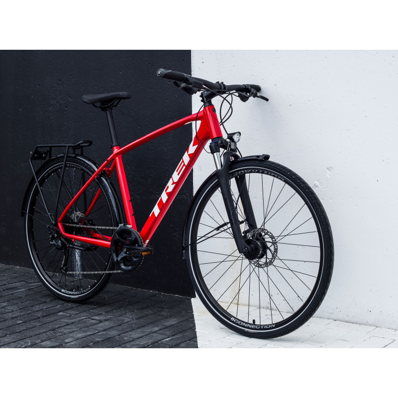 Ľahký hliníkový rám, uzamykateľná odpružená vidlica, hnacie ústrojenstvo Shimano 2x9 so širokým rozsahom prevodov, predný dynamový náboj pre napájanie svetiel, rýchle plášte Bontrager s extra trakciou do každého terénu, hydraulické kotúčové brzdy, ergonomické gripy, blatníky, svetlá, stojan a zadný nosič kompatibilný s MIK systémom.