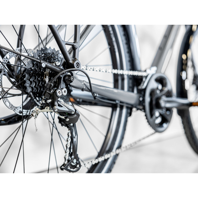 Srdcom modelu Touring je vysokokvalitný hliníkový rám s nízkou hmotnosťou a dvojitým stenčovaním rúrok. Trapézové vyhotovenie je jednoduché a elegantné, bez toho, aby bola obetovaná pevnosť alebo bezpečnosť. Je navrhnutý s našou geometriou Efficient Comfort, ktorá uľahčuje aj dlhé dni v sedle, a prekvapí vás svojou svižnosťou a intuitívnym ovládaním. Vďaka prevodovým lankám vedeným vo vnútri spodnej rámovej rúrky pre dlhotrvajúce presné radenie s minimálnou údržbou si môžete len užívať jazdu. Náš elegantný polointegrovaný nosič batožiny znamená, že si môžete vziať všetko, čo na cestu potrebujete, a vďaka stojanu Flat Mount je parkovanie bicykla hračka.
