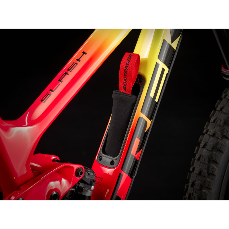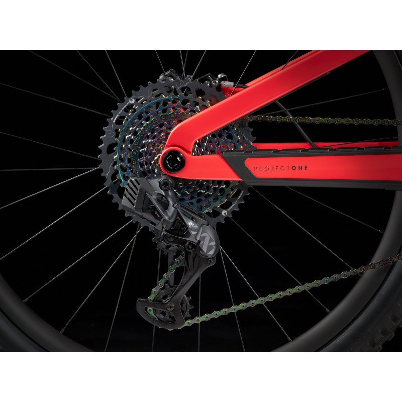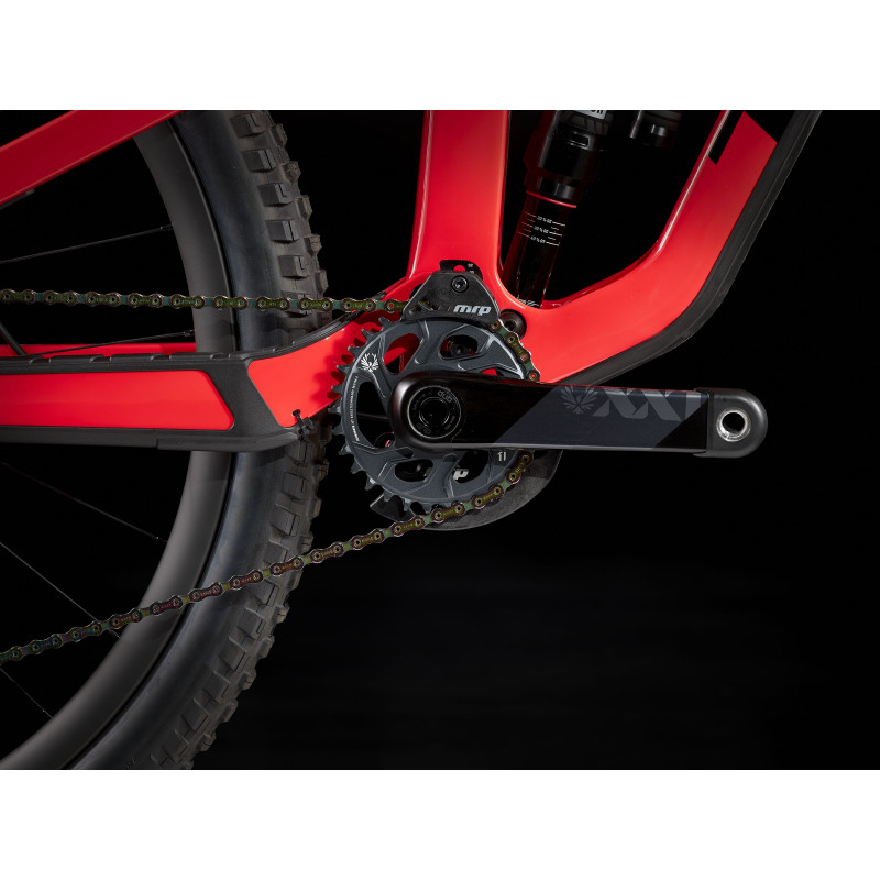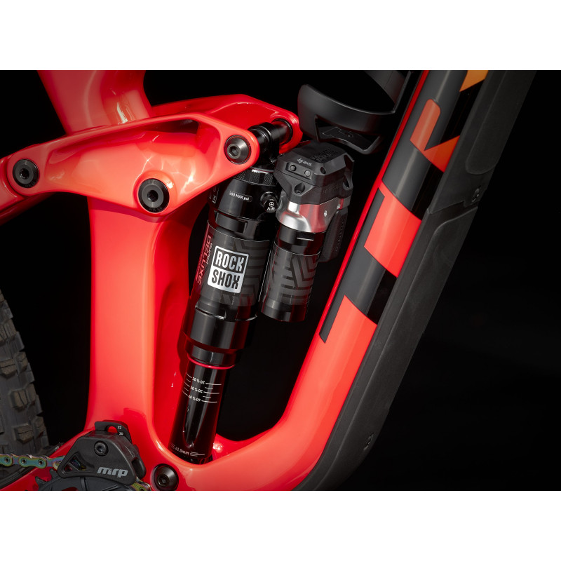 Kompletný rám OCLV Mountain Carbon s 160 mm zdvihom, RockShox Super Deluxe Ultimate s aktualizovaným tlmičom Thru Shaft, vidlica RockShox ZEB Ultimate s mimoriadne mohutnými 38 mm stĺpikmi. Bezdrôtový elektronický ovládač tlmenia RockShox Flight Attendant automaticky prispôsobuje odpruženie tak, aby čo najlepšie zodpovedalo terénu. Bezdrôtové elektronické hnacie ústrojenstvo SRAM X01 Eagle AXS s kazetou 10–52, teleskopická sedlovka Reverb AXS, integrované riadidlá Bontrager RSL a uhlíkovými kolesami Line Pro 30 so 108-zubovým nábojom Rapid Drive.