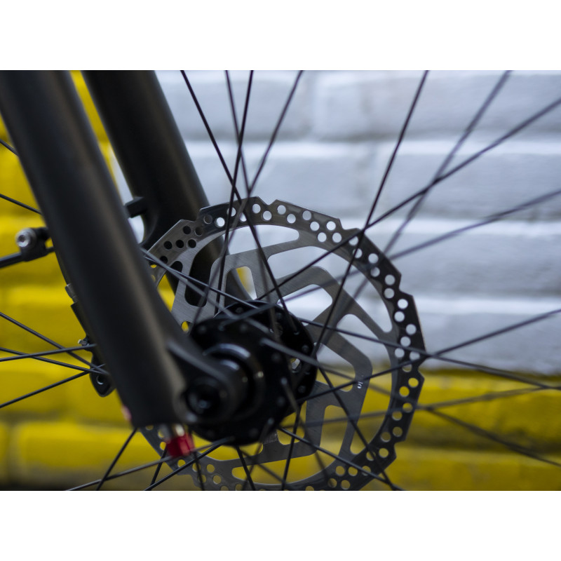 - Pevné 27,5 palcové kolesá s priečnymi oskami umožňujú spoľahlivú a stabilnú ovládateľnosť, zatiaľ čo veľkoobjemové plášte poskytujú viac pohodlia počas jazdy